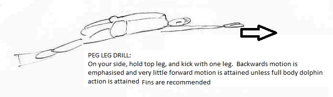 To do the Peg Leg drill you really should start with wearing fins. It is a very hard to do without rigorously driving the hips forwards and backwards; ie perfect dolphin action. This drill can be followed up with simply doing dolphin action on your side but also it can be done without fins for the very skilled swimmers.