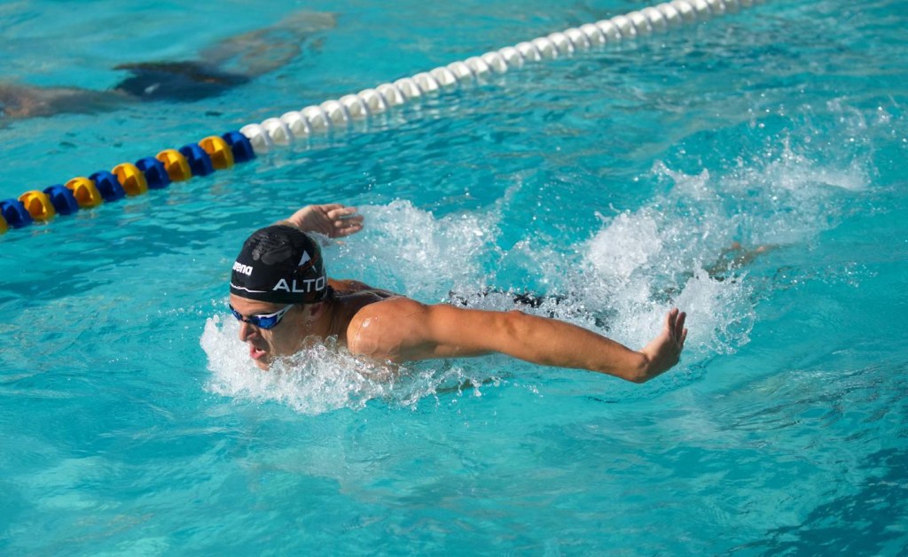 In the above photo of a fly swimmer, you can see the fingers and thumb are relaxed and pointed backwards. That allows the head to stay low and the natural wave to continue without a hitch. Then as the arms begin to arch down, the head also goes down, making a nice smooth stroke.